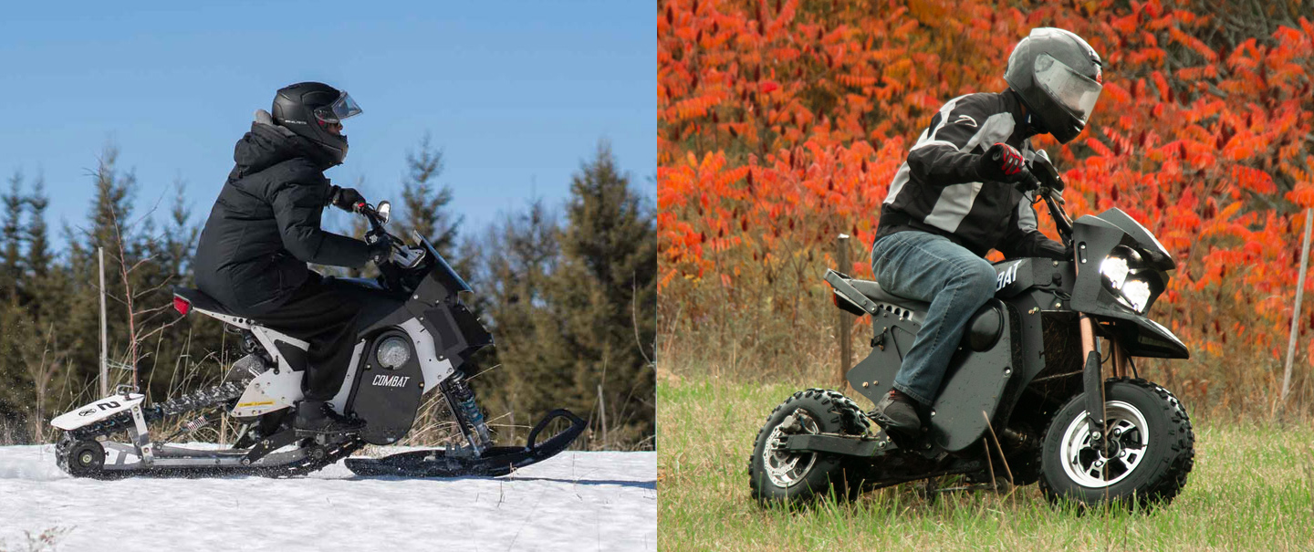 TORONTO (October 19, 2022) - (EINPresswire.com) Daymak Inc. has announced the brand-new Combat Ebike, the first of its kind: an all-terrain dirt bike that comes with a snow kit that transforms it from a dirt bike to a snow bike. With the snow kit, in about an hour you can change from wheels to track (or vice versa) so that you can ride regardless of the weather!